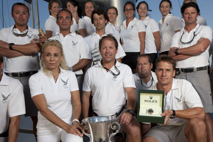 From Maltese Falcon: Tom Perkins, owner, Jerry Dykstra, designer, Chris Gartner, captain Ron Joyce (left) owner of Destination Fox Harb’r, winner of the Alloy Yacht Cup. ... Read More